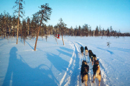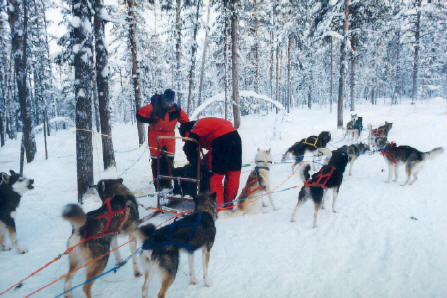 Im Februar 1998 mit Freunden eine 5-tägige geführte Husky-Tour von Blockhütte zu Blockhütte in Finnisch Lappland – s. unter Abenteuer Husky-Tour.